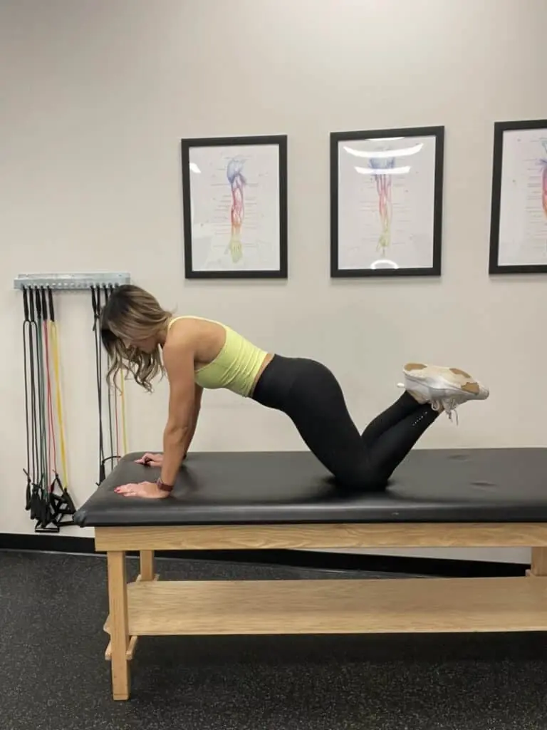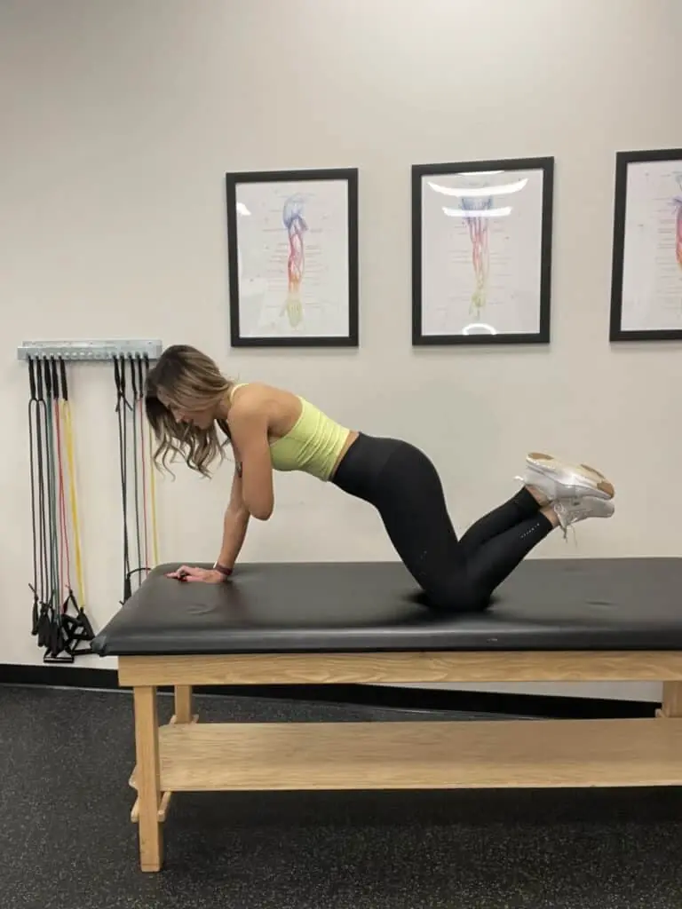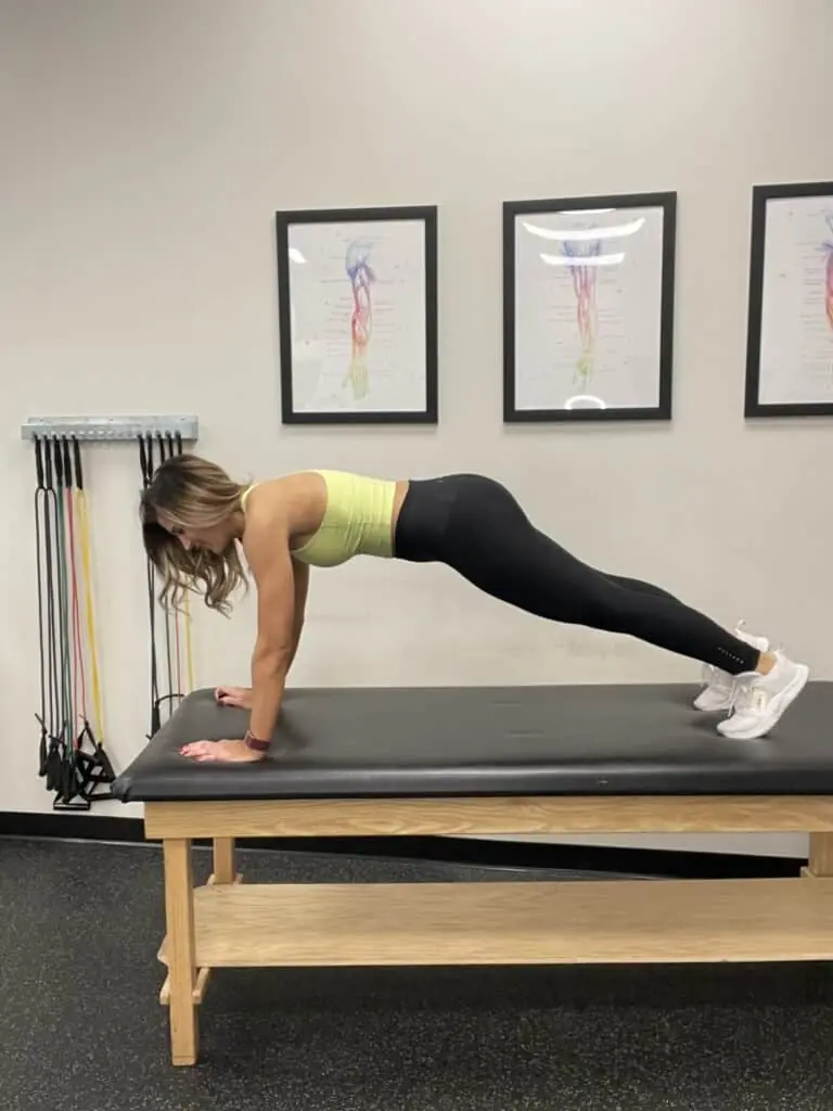 Start in a quadruped position, with your knees directly under your hips and your hands directly under your shoulders; ensure your back is straight and your abdominals are tight. Begin the exercise by slowly lifting one hand and tapping the front shoulder of your opposite arm. Make sure to keep your back straight and abdominals tight as you alternate the movement from one hand to the other. Complete three sets of 30 second reps. To make this more challenging, lift off your knees into a high plank.