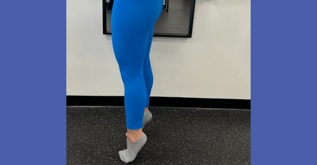 Calf raises: stand up straight and rise onto the balls of your feet (tip toes), then lower your heels to the floor. Repeat five times.
