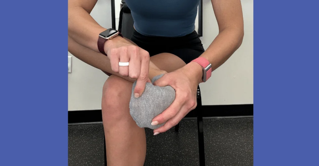 Towel scrunches: Sit in a chair with your feet flat on the floor. Lay a washcloth or kitchen towel on the floor in front of you. Put your toes on the end of the towel and scrunch your toes so the towel is pulled towards you. Repeat five times.