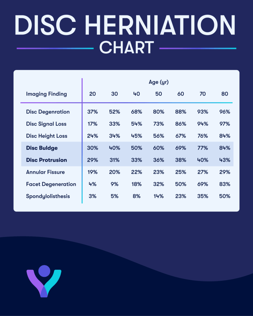 The chart above shows how common it is to have a structural issue found on an MRI in asymptomatic people. For example, 60% of people in their fifties showed a disc bulge, but had zero symptoms. In other words, findings on a scan don’t always match what you feel.